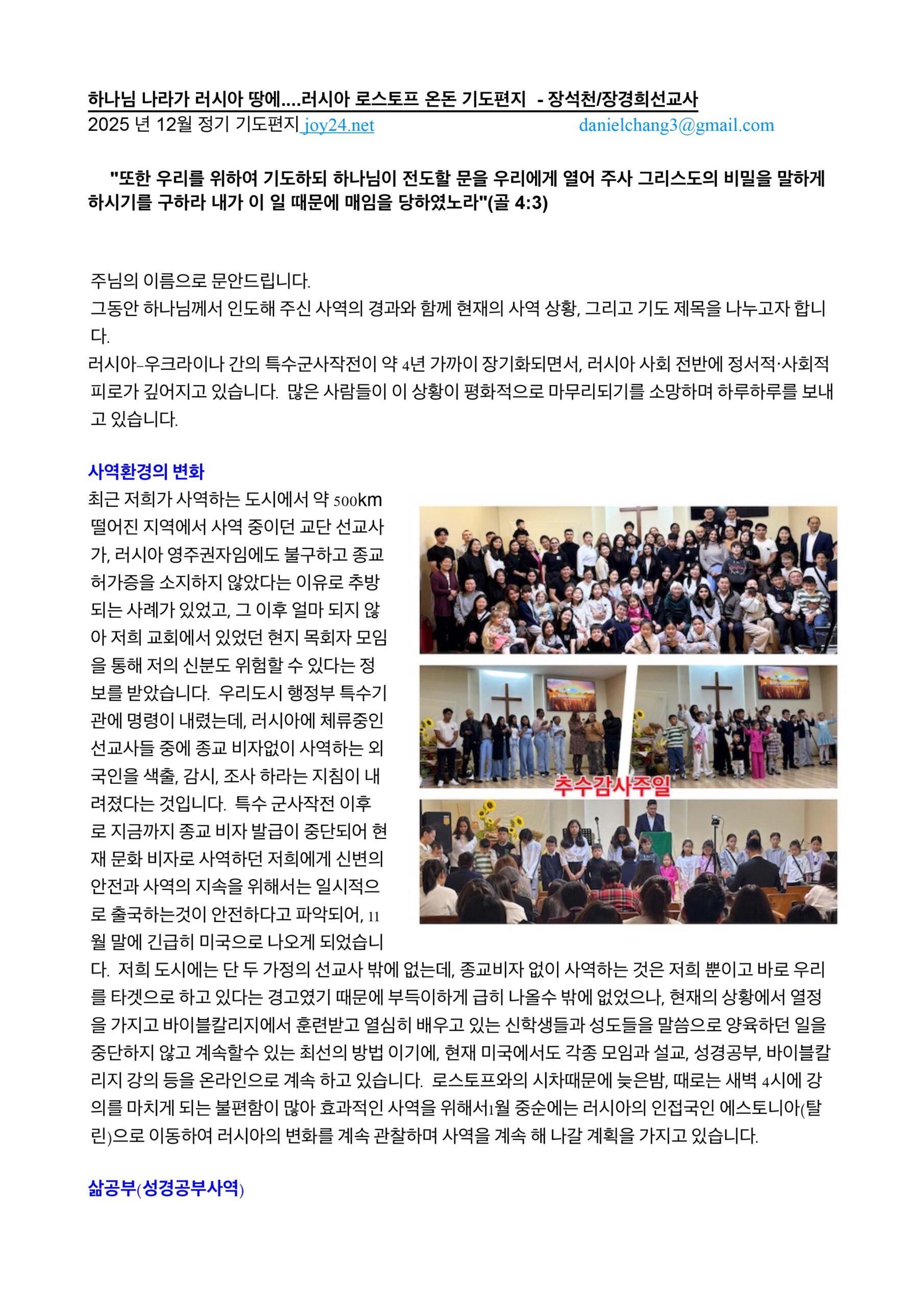 러시아 – 장석천 장경희 선교사 12월 선교편지